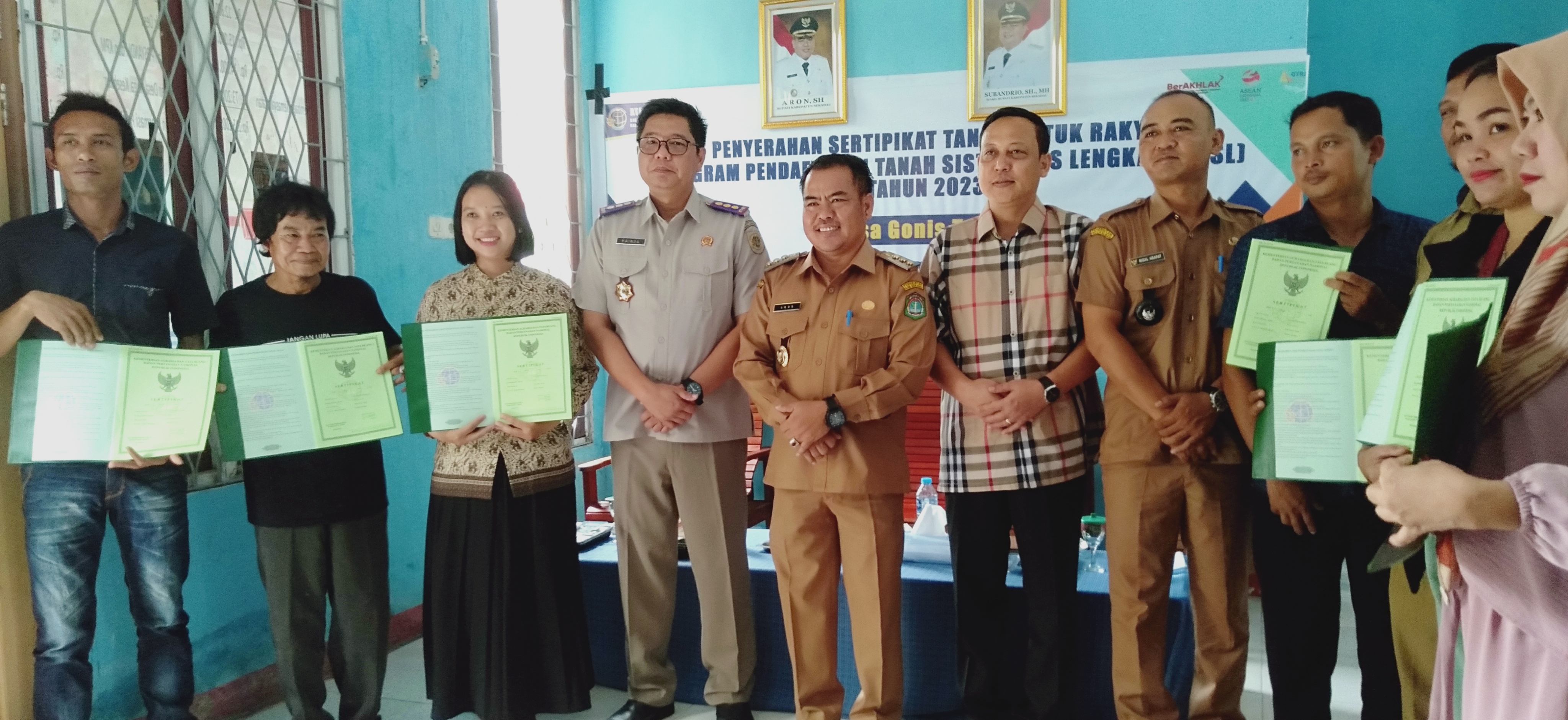SEKADAU-FAKTAPAGI.COM.Bupati Sekadau Aron, SH kembali menyerahkan secara simbolis Sertifikat hasil Pendaftaran Tanah Sistematis Lengkap (PTSL) kepada warga desa Gonis Tekam, Senin (10/07/2023) di kantor desa Gonis Tekam.
